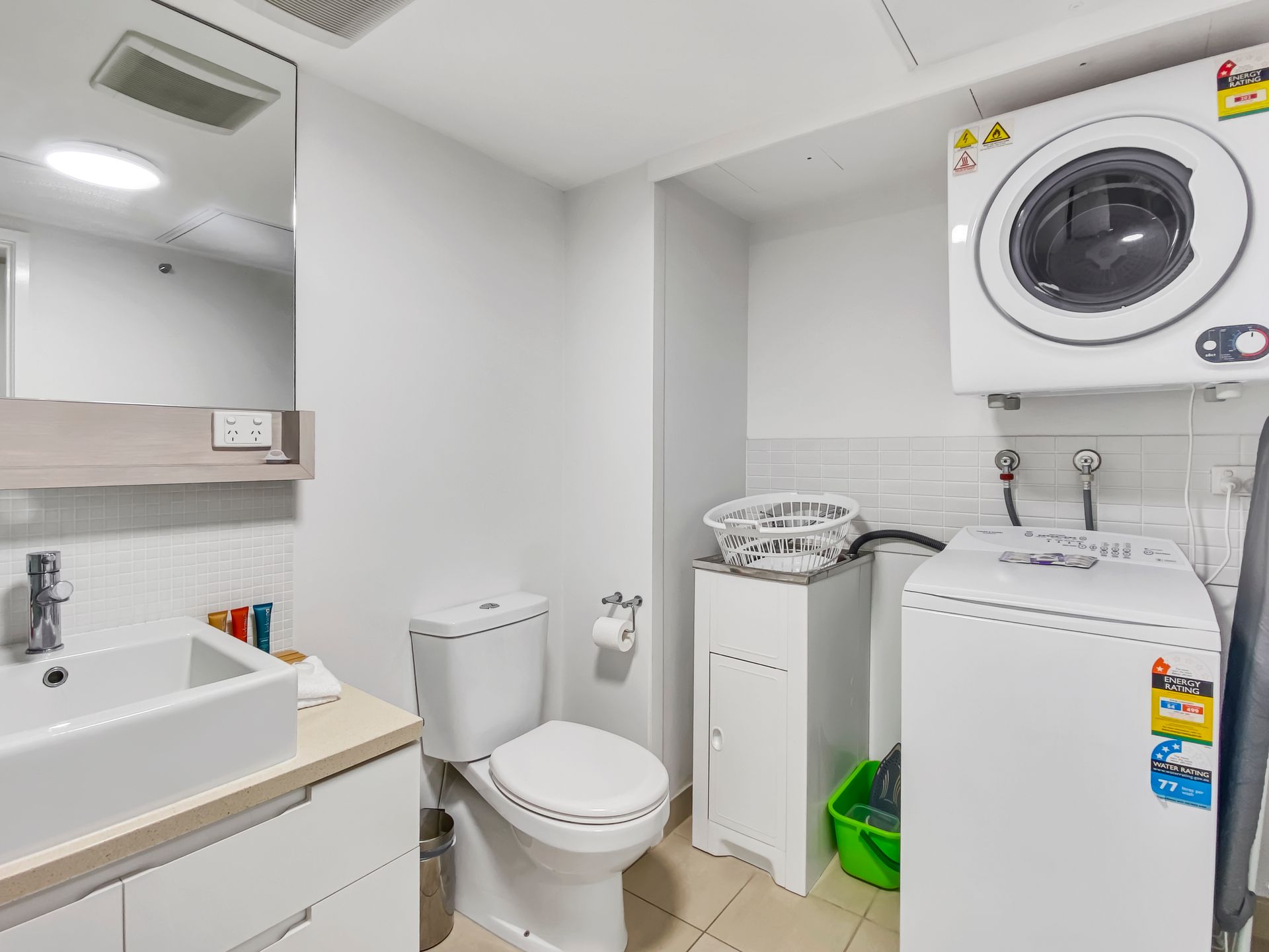 The first room boasts a queen-sized bed with direct access to an en-suite bathroom and bath with water views. The second bedroom showcases two comfy single beds perfect for children or friends. The second bathroom doubles as a conveniently located laundry room with a clothes dryer and washing machine to help freshen up throughout your stay.