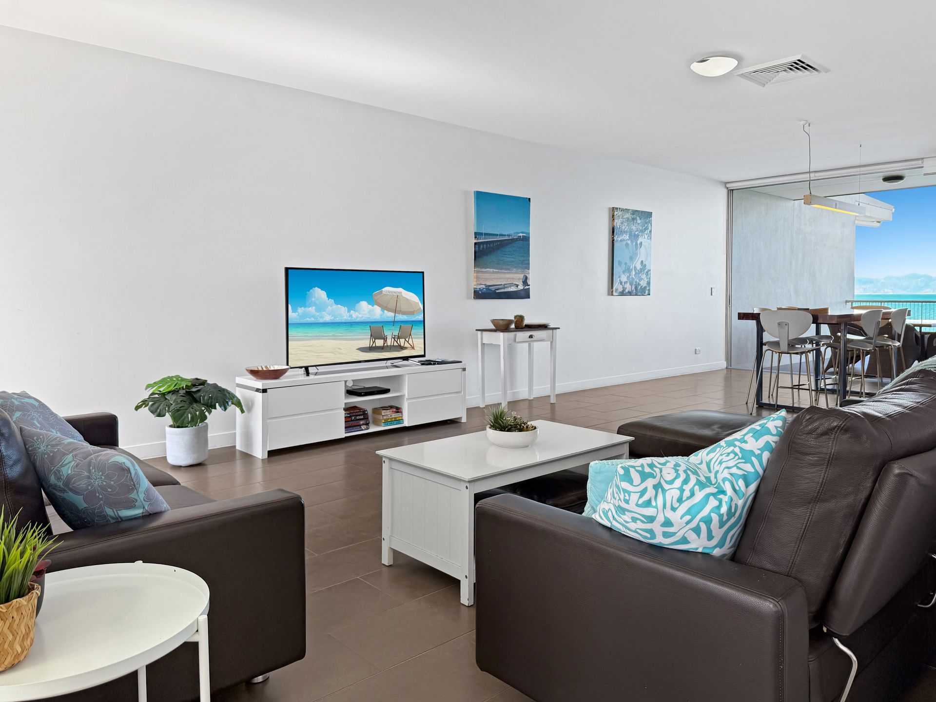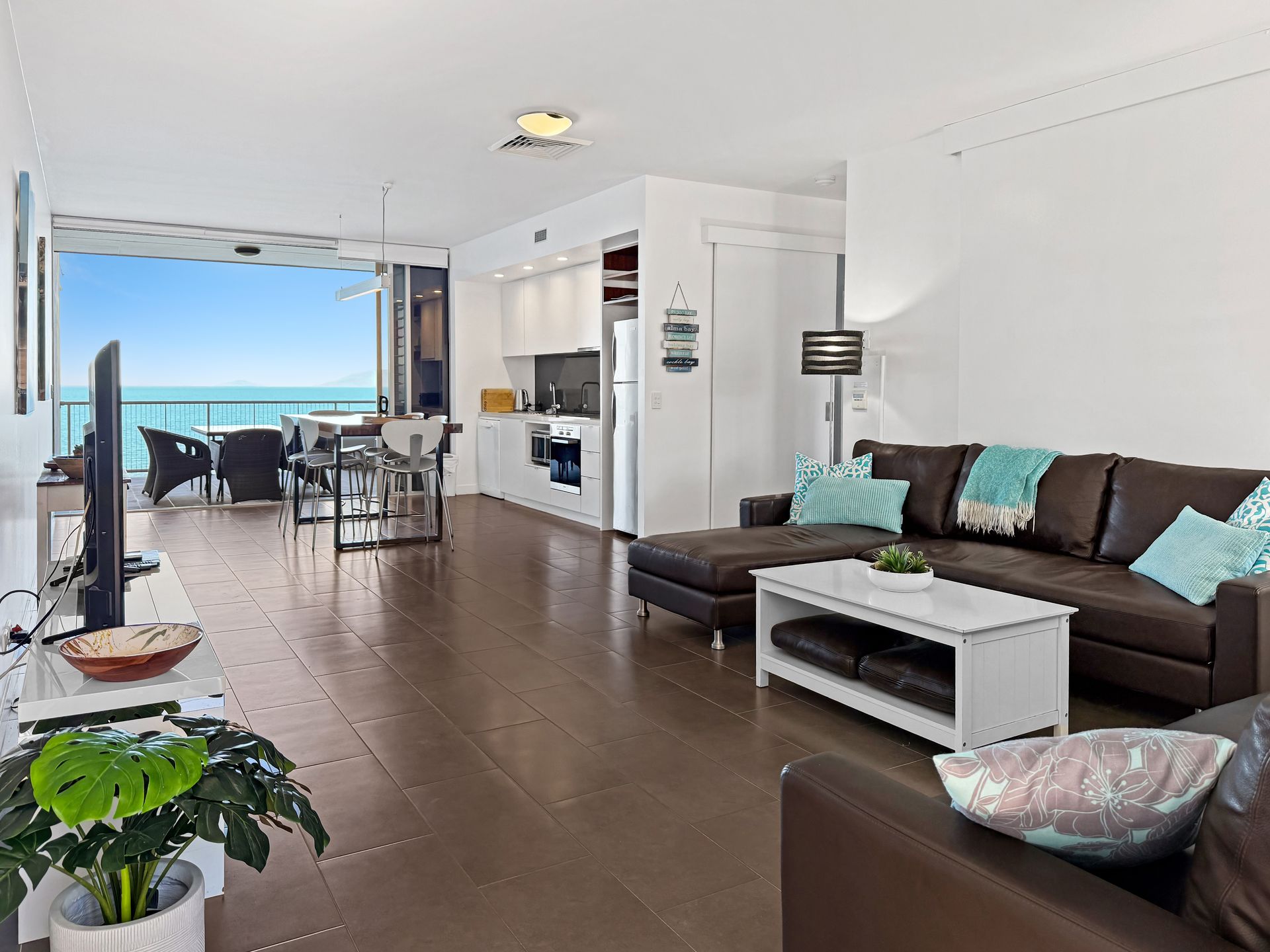 This fantastic 2 bedroom, 2 bathroom, oceanfront apartment is perched on the 5th floor, the highest level to take in all the wonderful view on offer. The Coral Sea is lapping on the granite boulders fringing the waters edge. Take in the lights of Townsville at night after watching the sun sink below Hawkings Point to the west of One Bright Point.