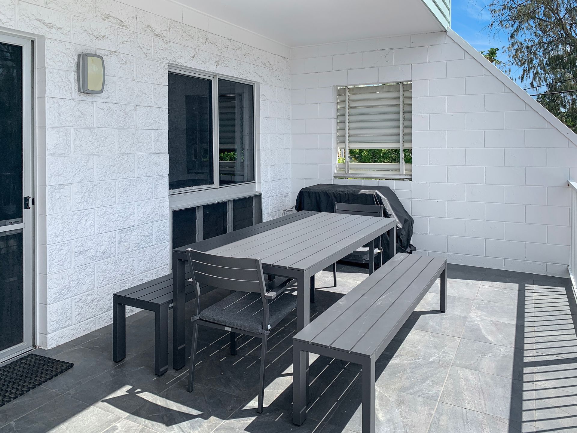 Relax and recharge in this elegant and cosy beachfront house. The place has air-conditioning throughout to ensure your comfort. This unit has a cosy living room with a TV, perfect for lounging. Right next to it, you can walk over to the balcony with outdoor furniture. There's also a BBQ, making it an ideal spot for a fun brunch or socialising. From there, you can breathe in the calm sea breeze and enjoy the panoramic ocean views.