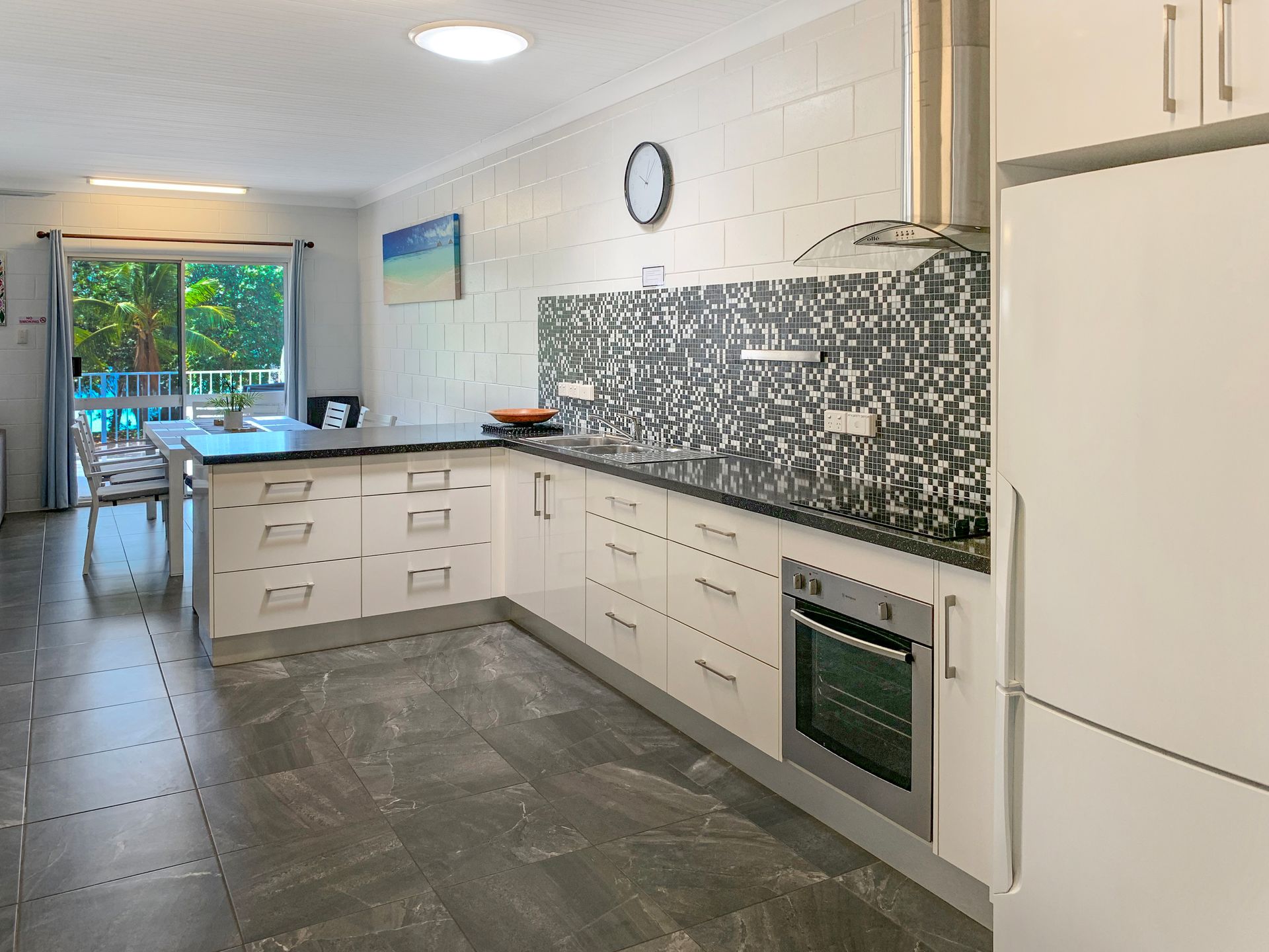 The large balcony off the living area faces towards the beach so you can enjoy your favourite drink or have a quick rest after swimming while taking in the view. In the perfect location across the road from Geoffrey bay you can easily take a quick stroll to enjoy the sand and sea. You can also take a dip and mingle with others at the communal pool. The whole place gives you the comfort and conveniences you need for a great beach holiday!