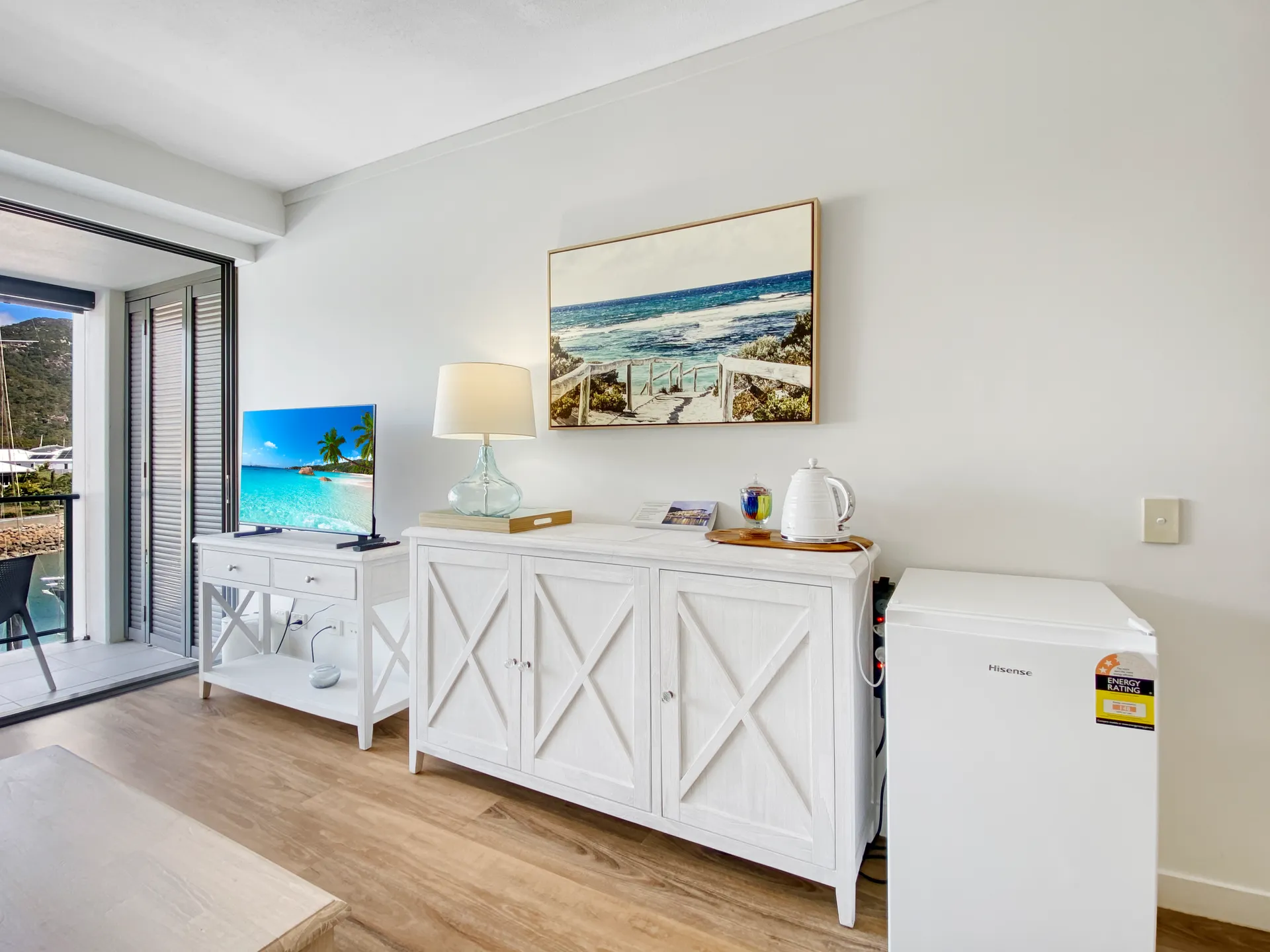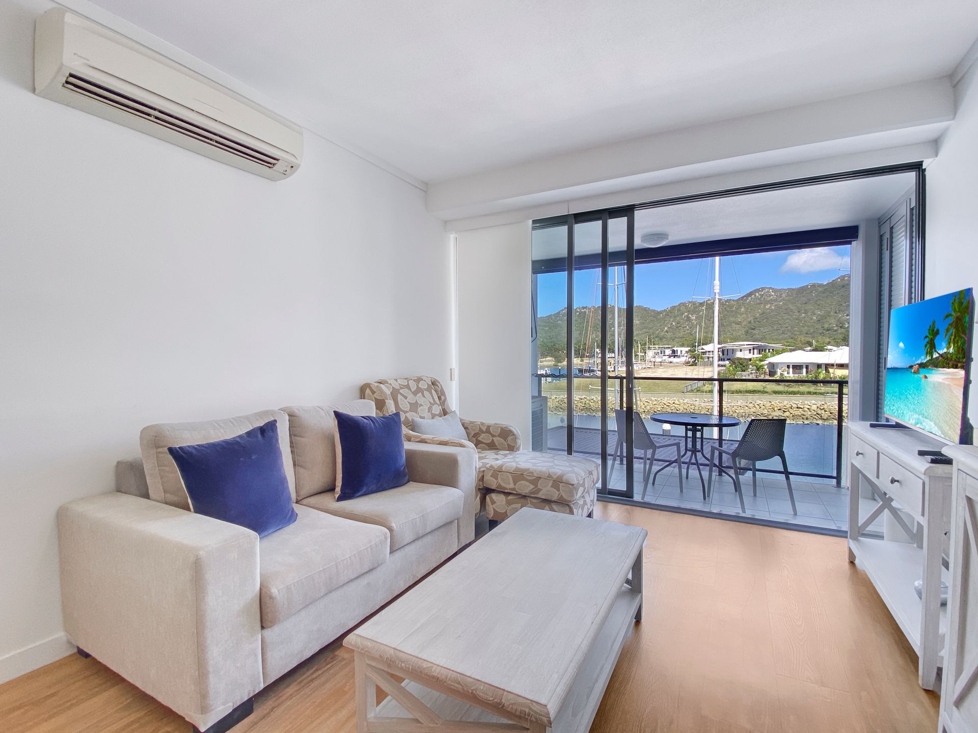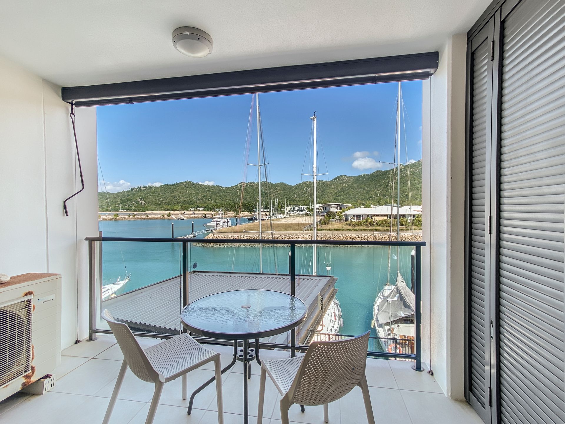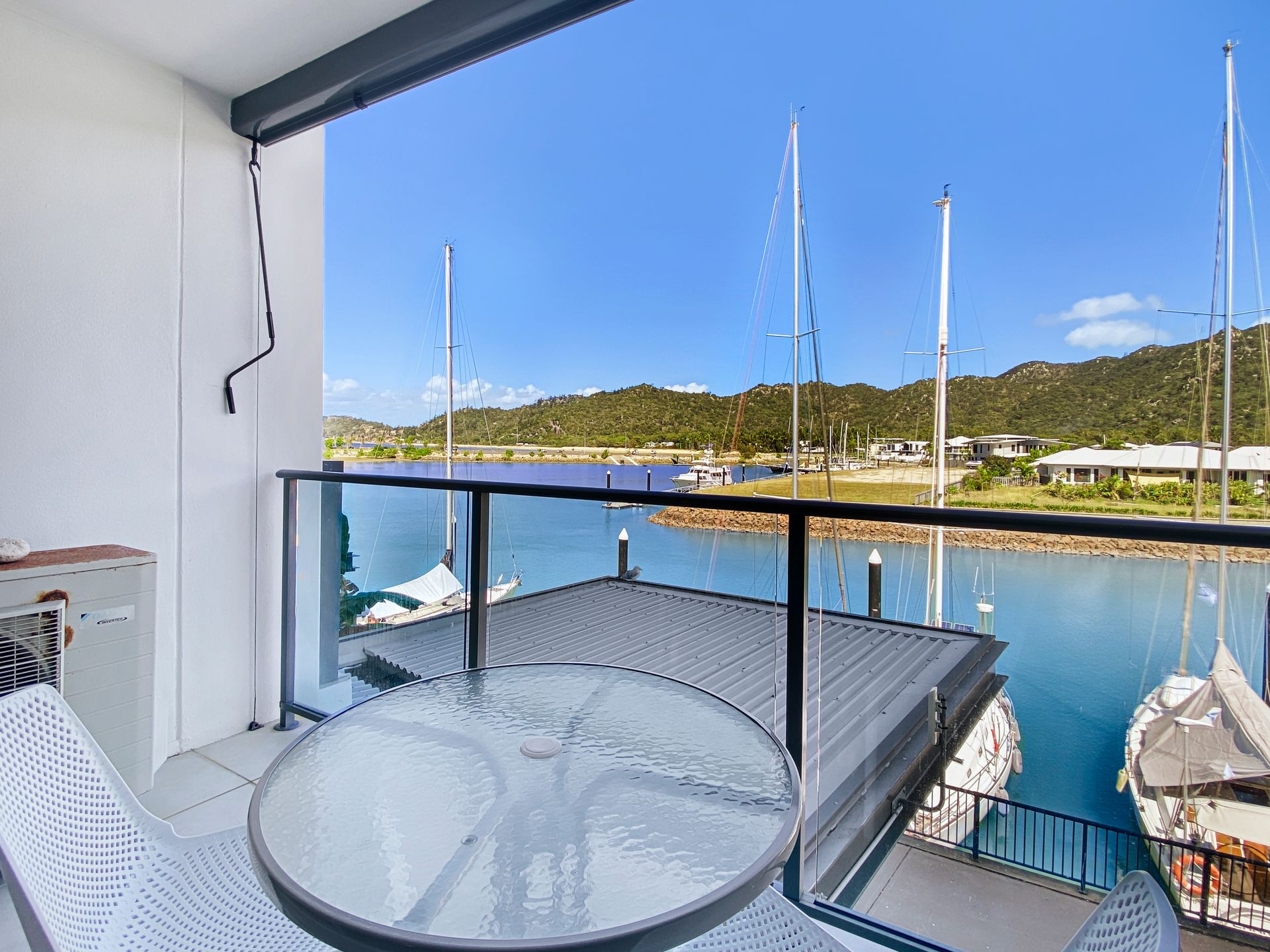 The studio has an ensuite, lounge area with TV and a private marina front balcony with outdoor setting.
