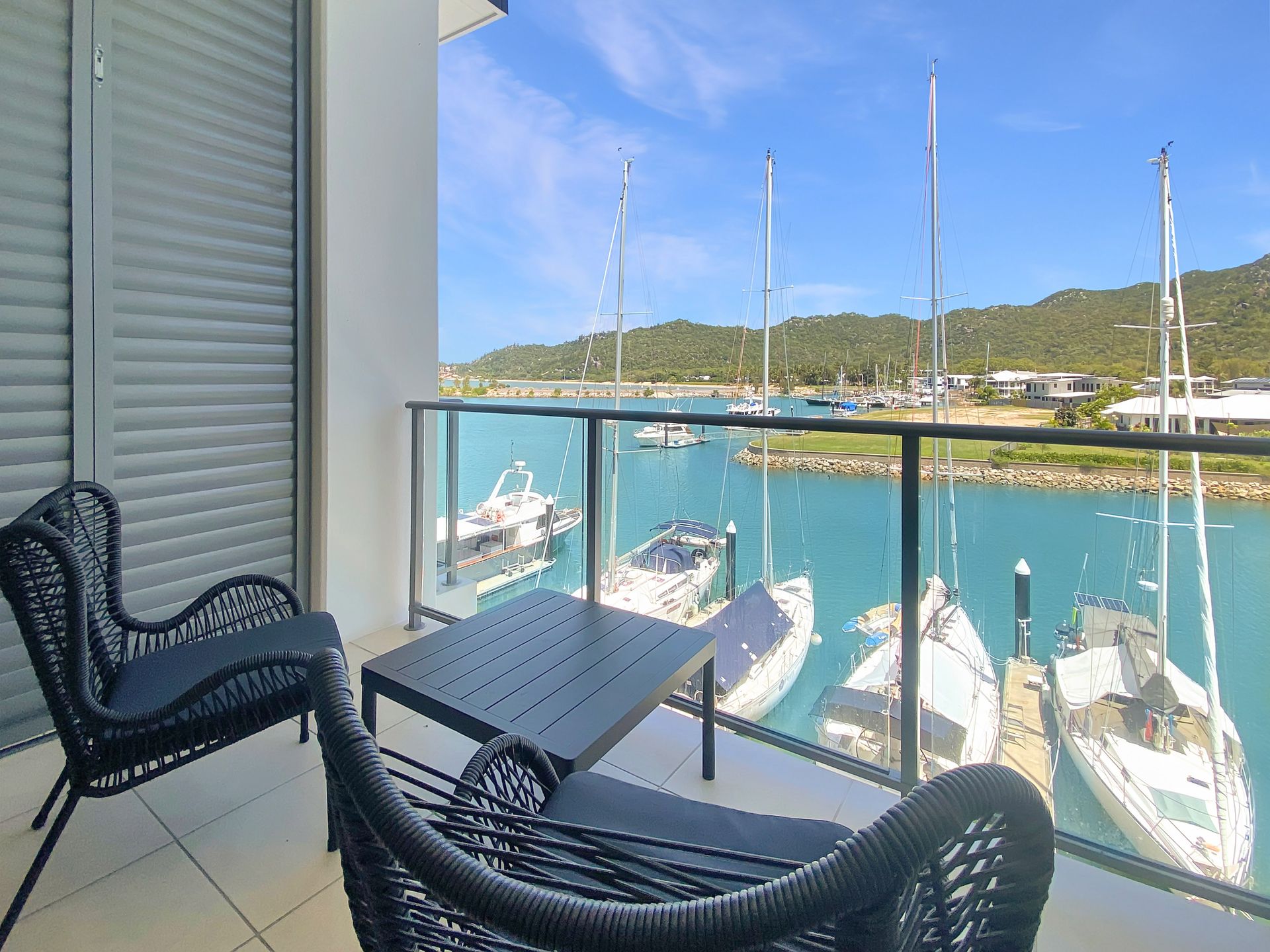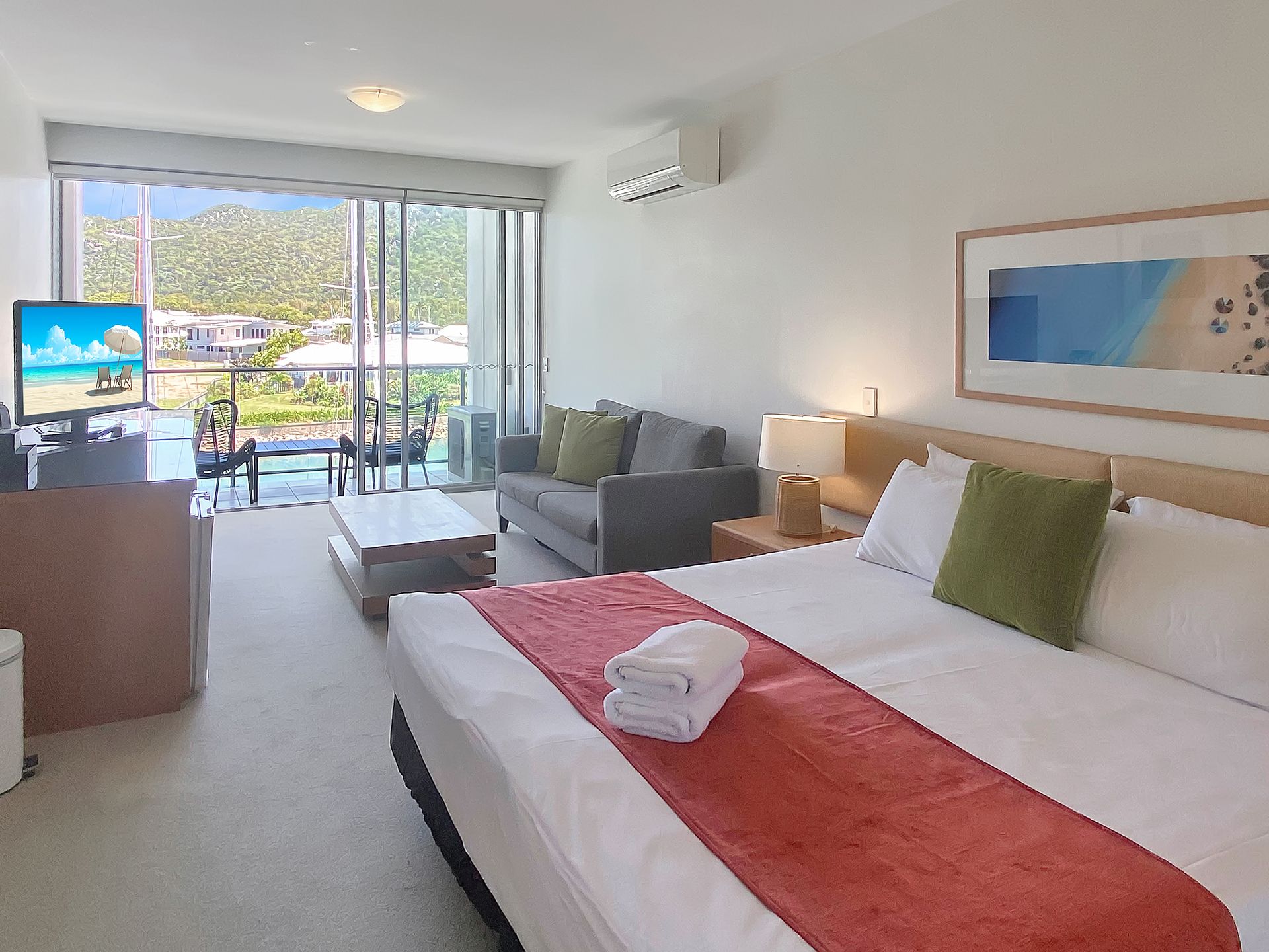 The studio has an ensuite, lounge area with TV and a private marina front balcony with outdoor setting.