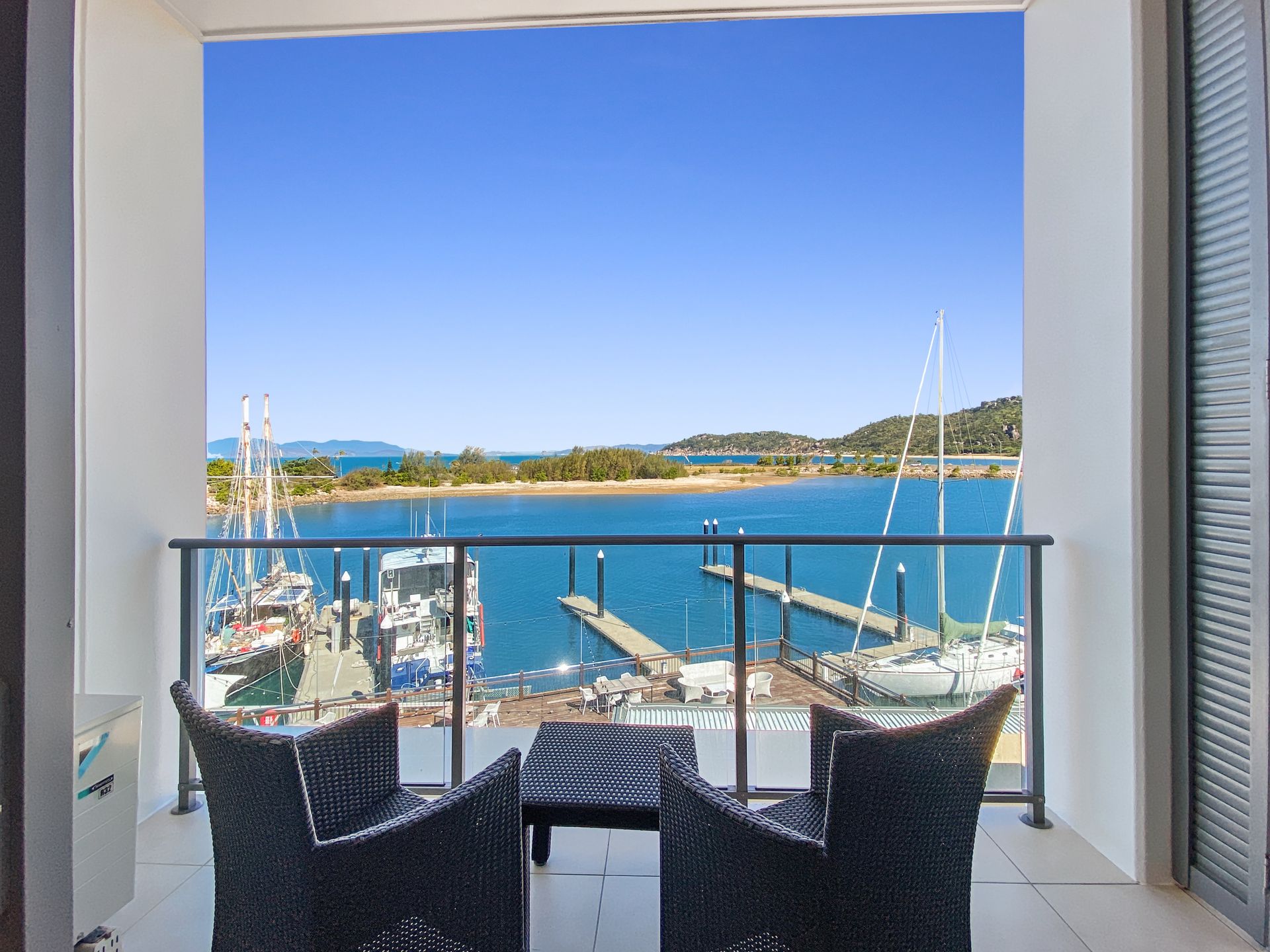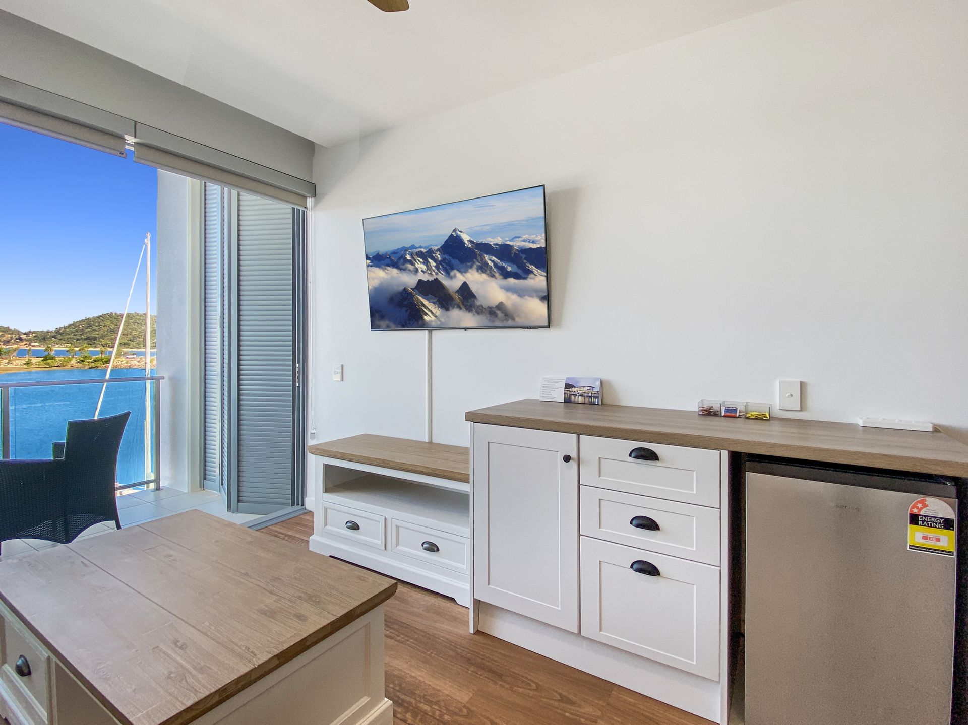 The studio has an ensuite, lounge area with TV and a private marina front balcony with outdoor setting.