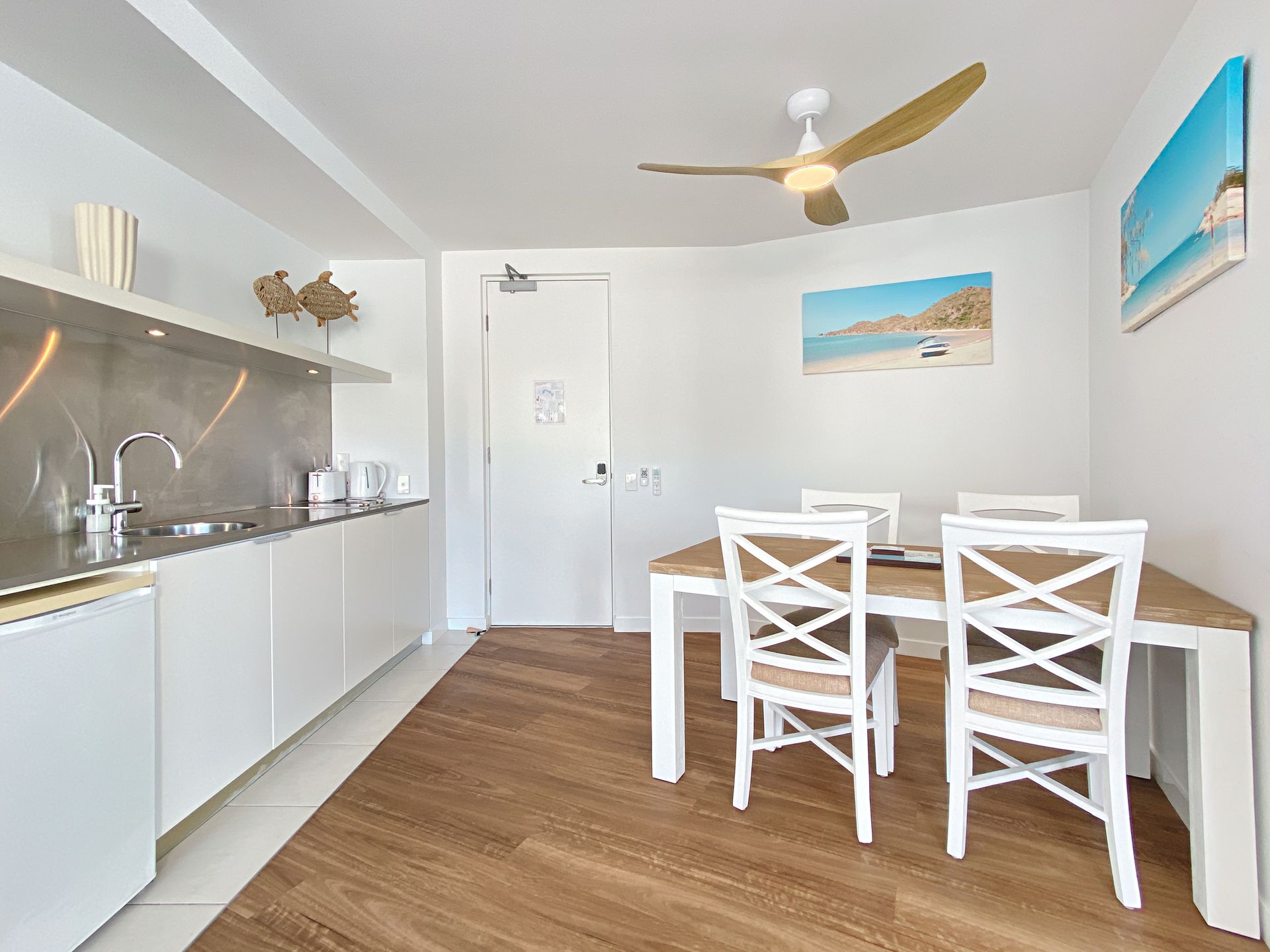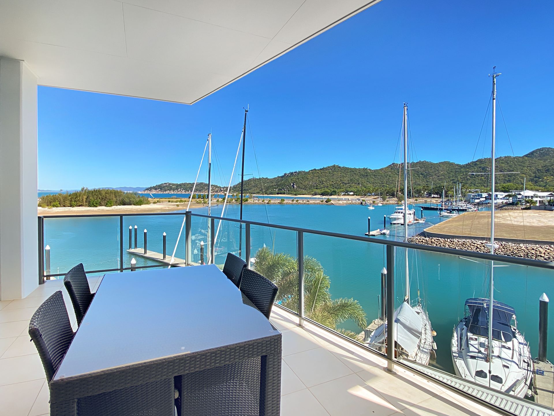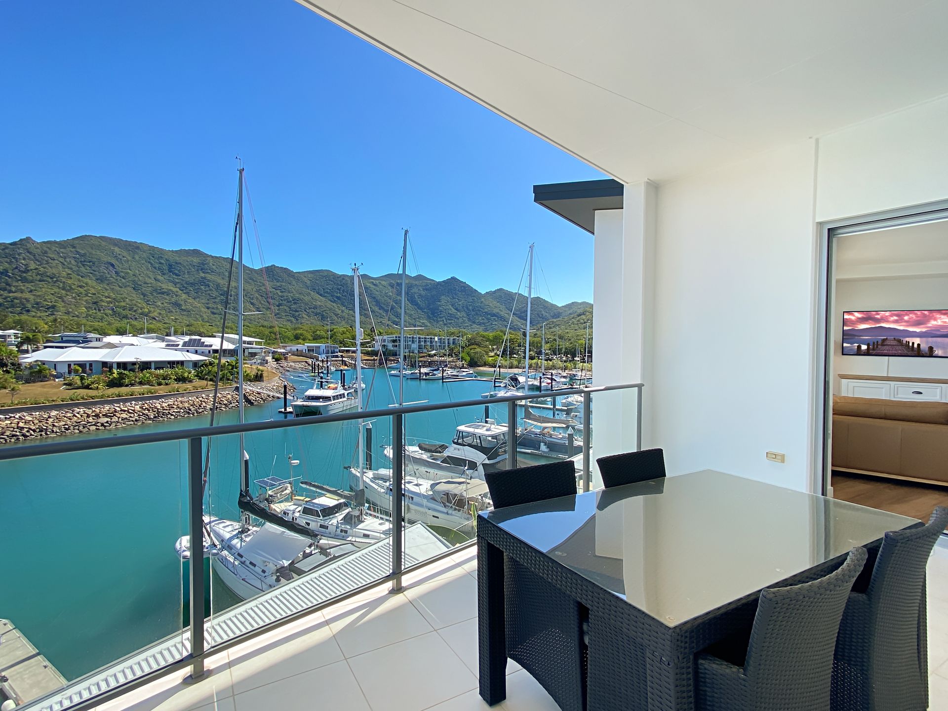 The studio has an ensuite, lounge area with TV and a private marina front balcony with outdoor setting.