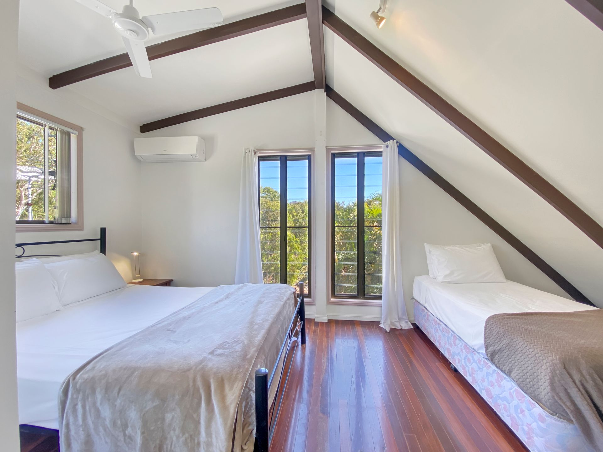 Bedroom 2 upstairs has a Queen bed and a Single bed.