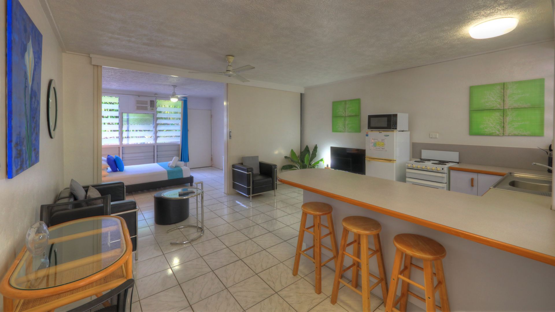 The lovely, bright unit is air-conditioned and equipped with self-contained kitchen facilities including a full oven, fridge and microwave. The lounge area has a large, flat screen TV and a cosy dining table for 2, plus breakfast bar seating.