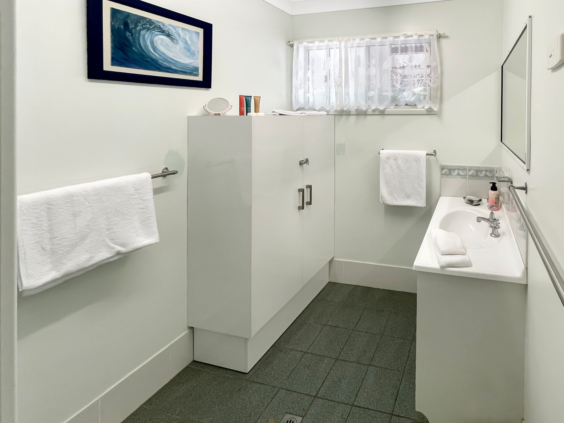 The main bedroom has a king bed and ensuite, with the other two bedrooms sharing the main bathroom and are furnished with a queen sized bed in the 2nd bedroom, and a tri-bunk in the third (single bed on top, double bed below). All bed linen and bath towels are provided for guests.
