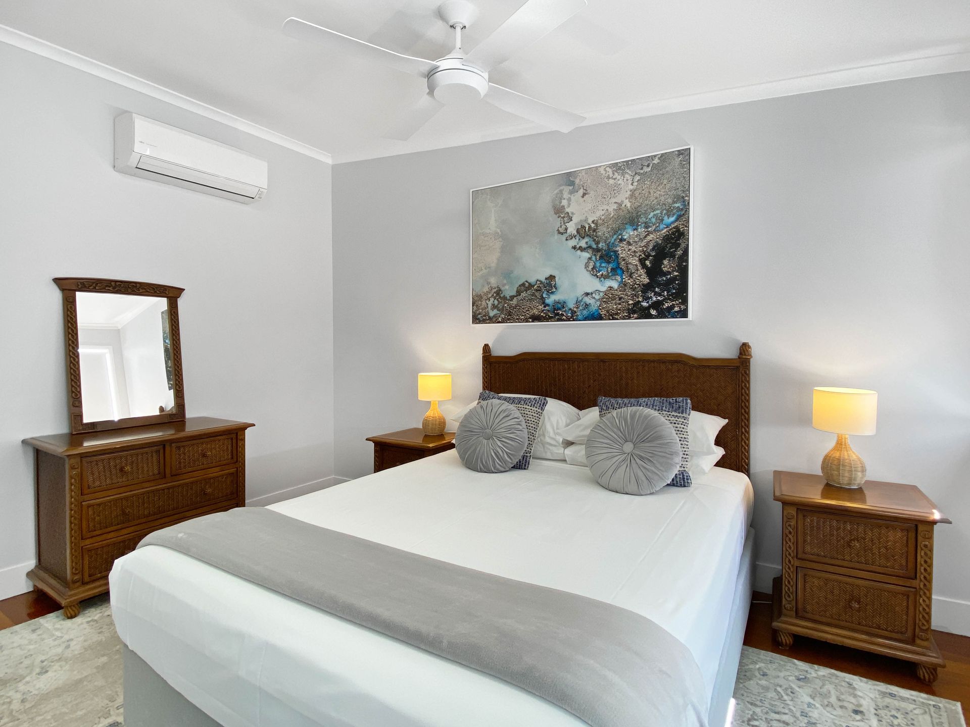 Bedroom 2: Queen bed, air-conditioning, and ceiling fan