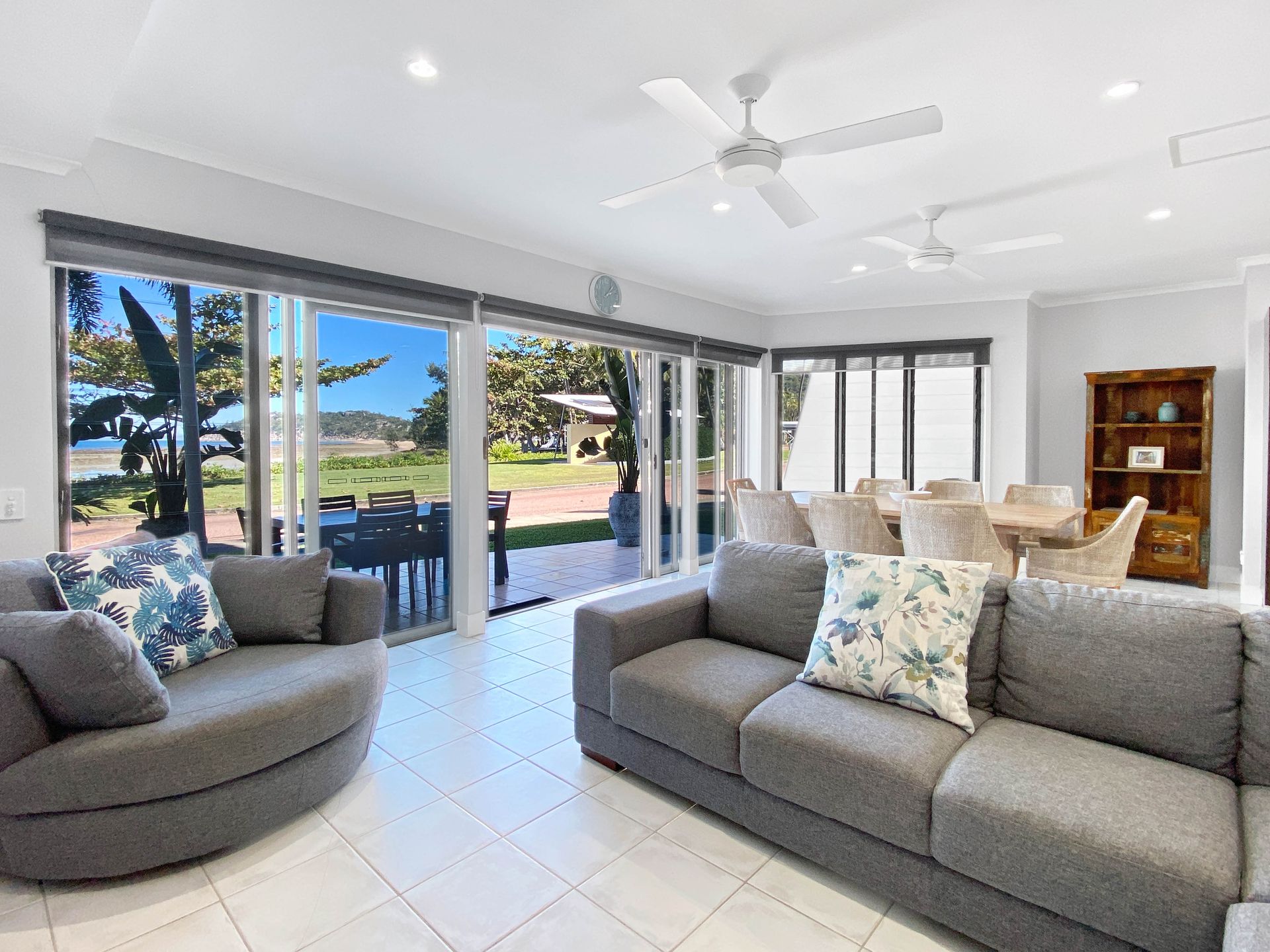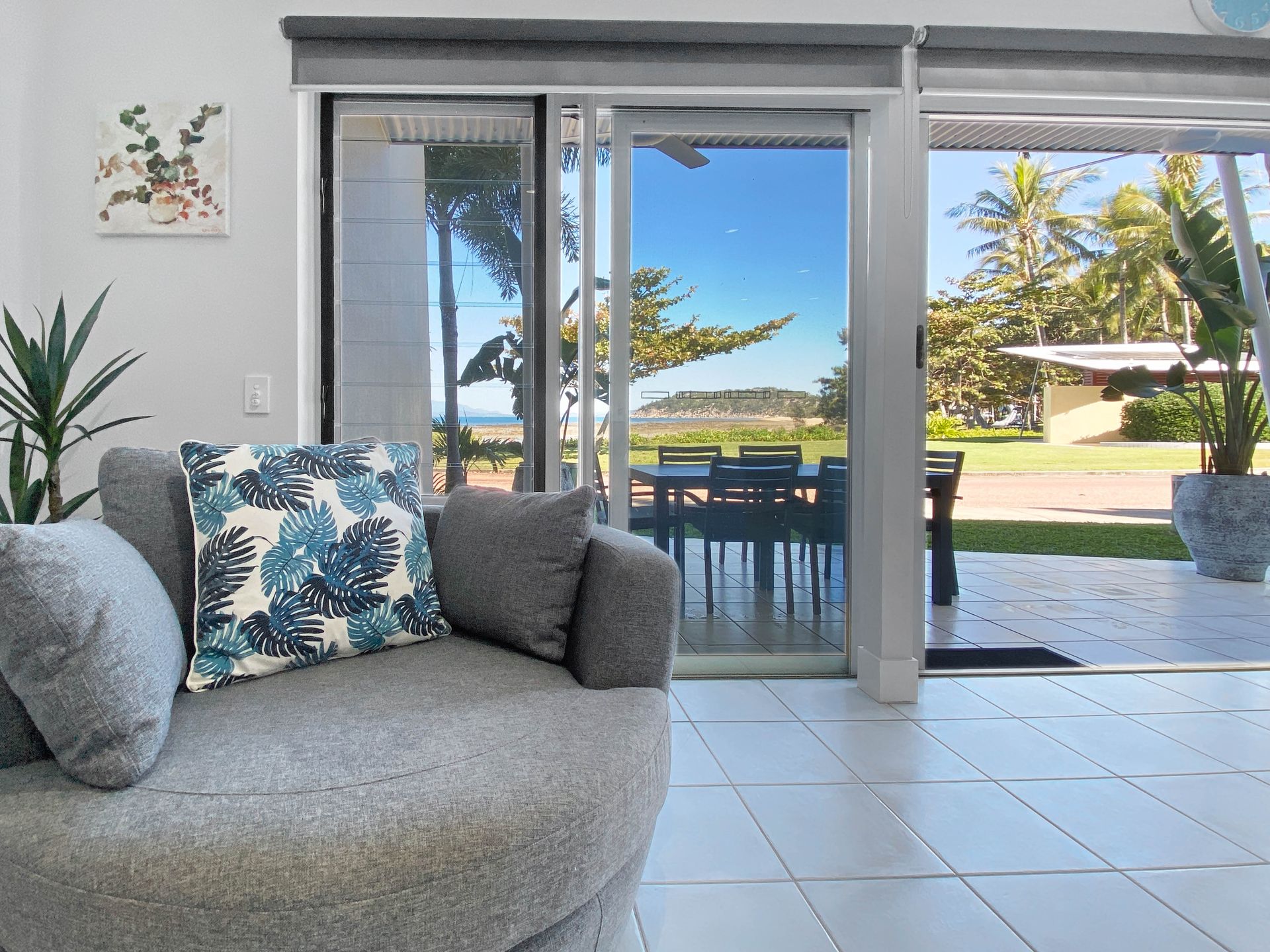 There's lots of space and comfy sofas to mingle and relax on this memorable vacation. Grab a book, board game, or enjoy a movie night on the TV. The open-plan kitchen, dining, and living areas are flooded with natural light, while guests can step out onto the patio with seating for eight and enjoy their meals with sea breezes and impressive beach views.