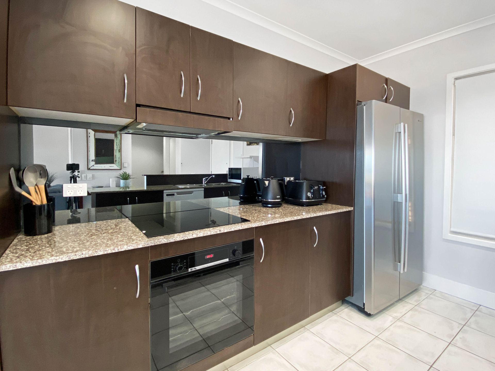 The fully equipped sleek kitchen is easily accessible and perfect for preparing casual meals or group feasts hassle-free thanks to the kitchen's amenities and equipment, such as: