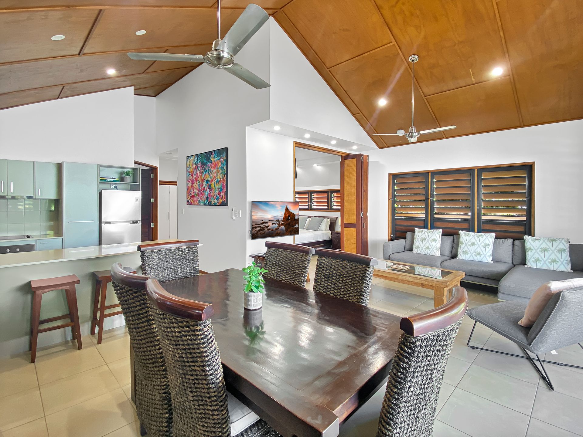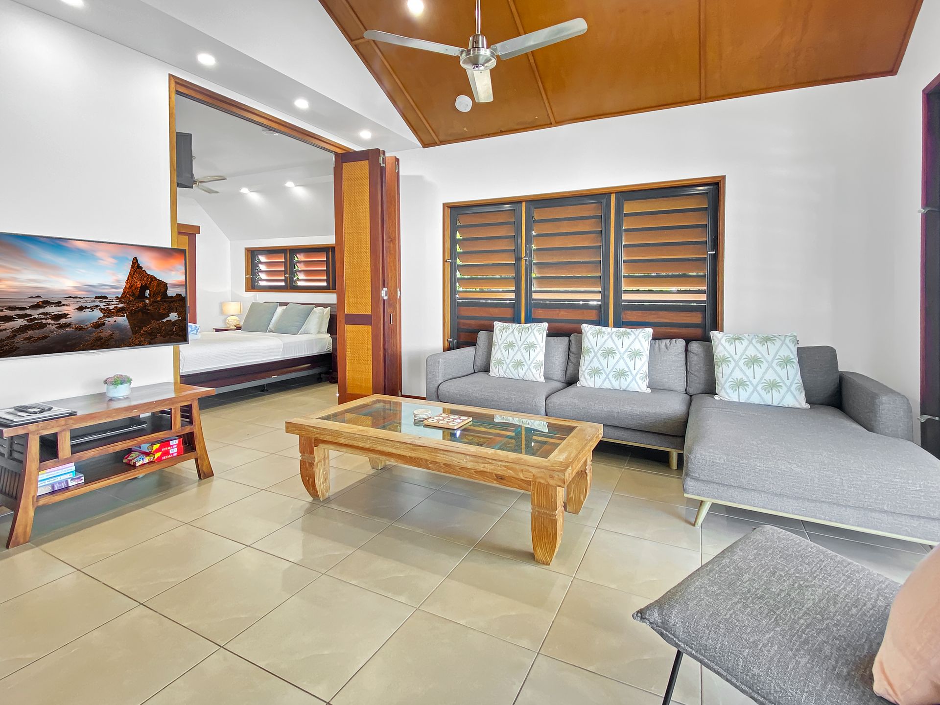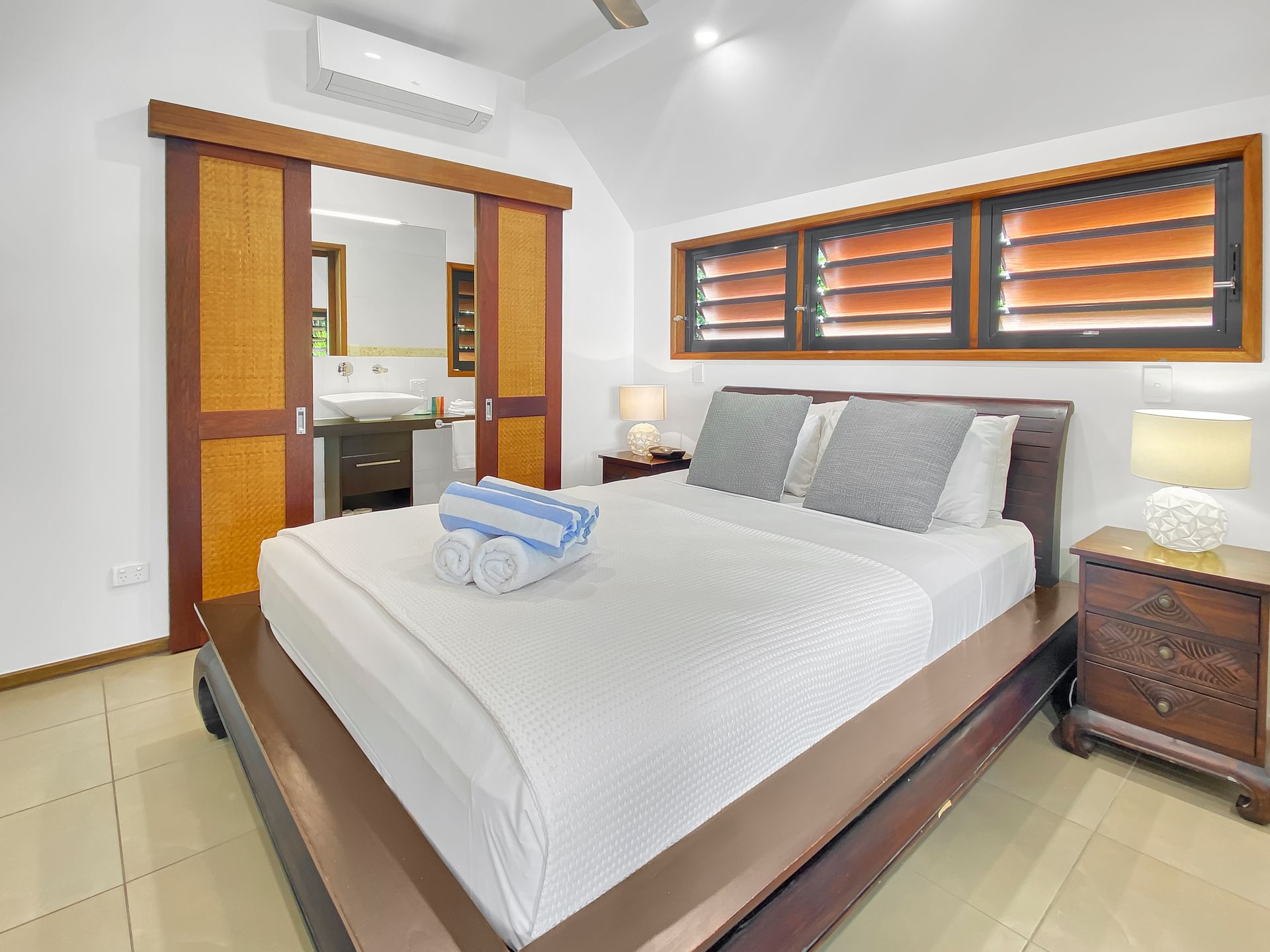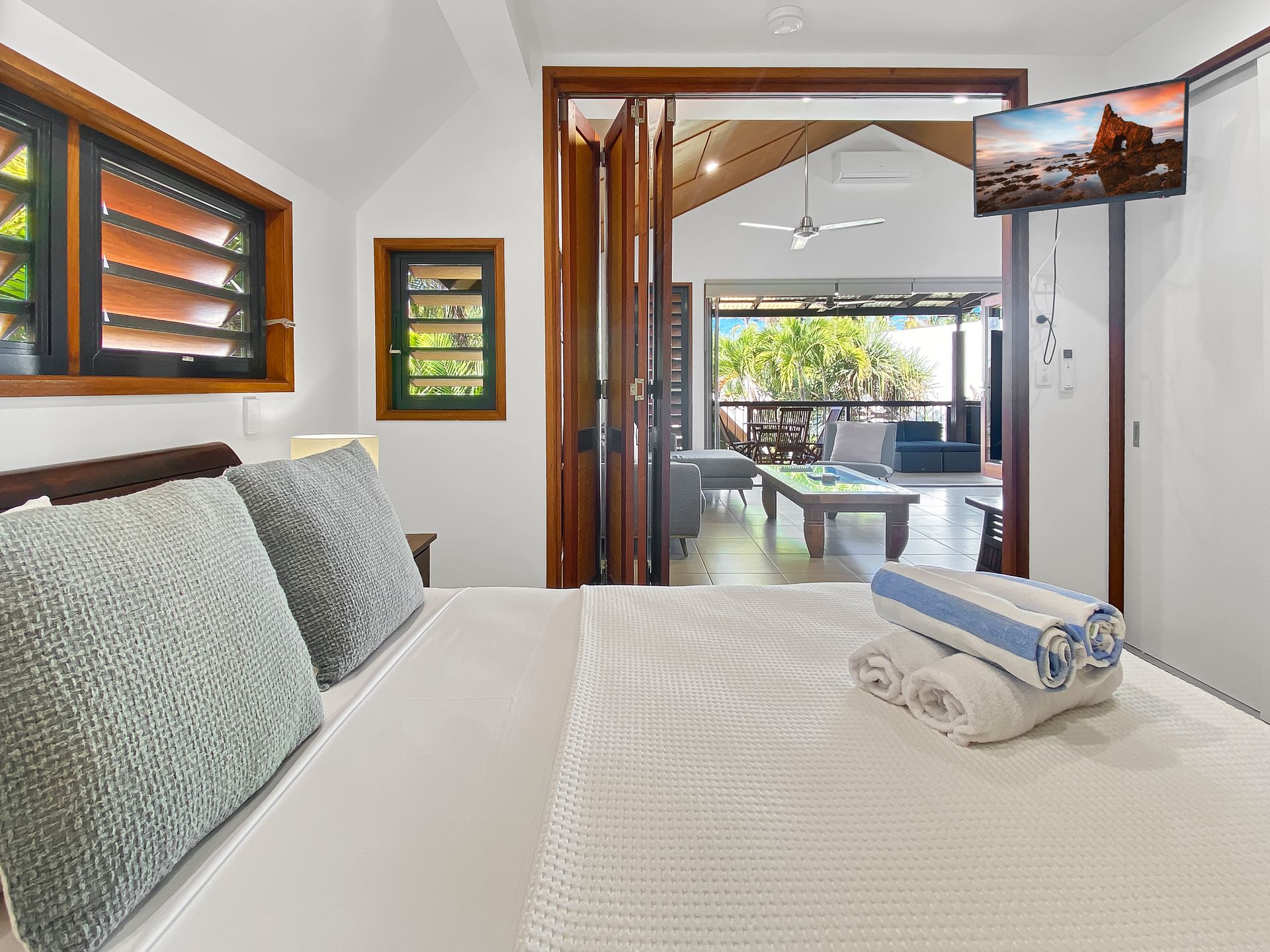 Airconditioned throughout, these two bedroom, two bathroom (one with spa bath) villas provide ample space and privacy. The 2nd bedroom can feature a king bed or 2 king singles and your preference can be requested at the time of booking. The living area has bifold panoramic doors opening on to your private covered verandah. Take the weight of the world off as you relax on cushioned lounges complete with foot stools, so you can really put your feet up.