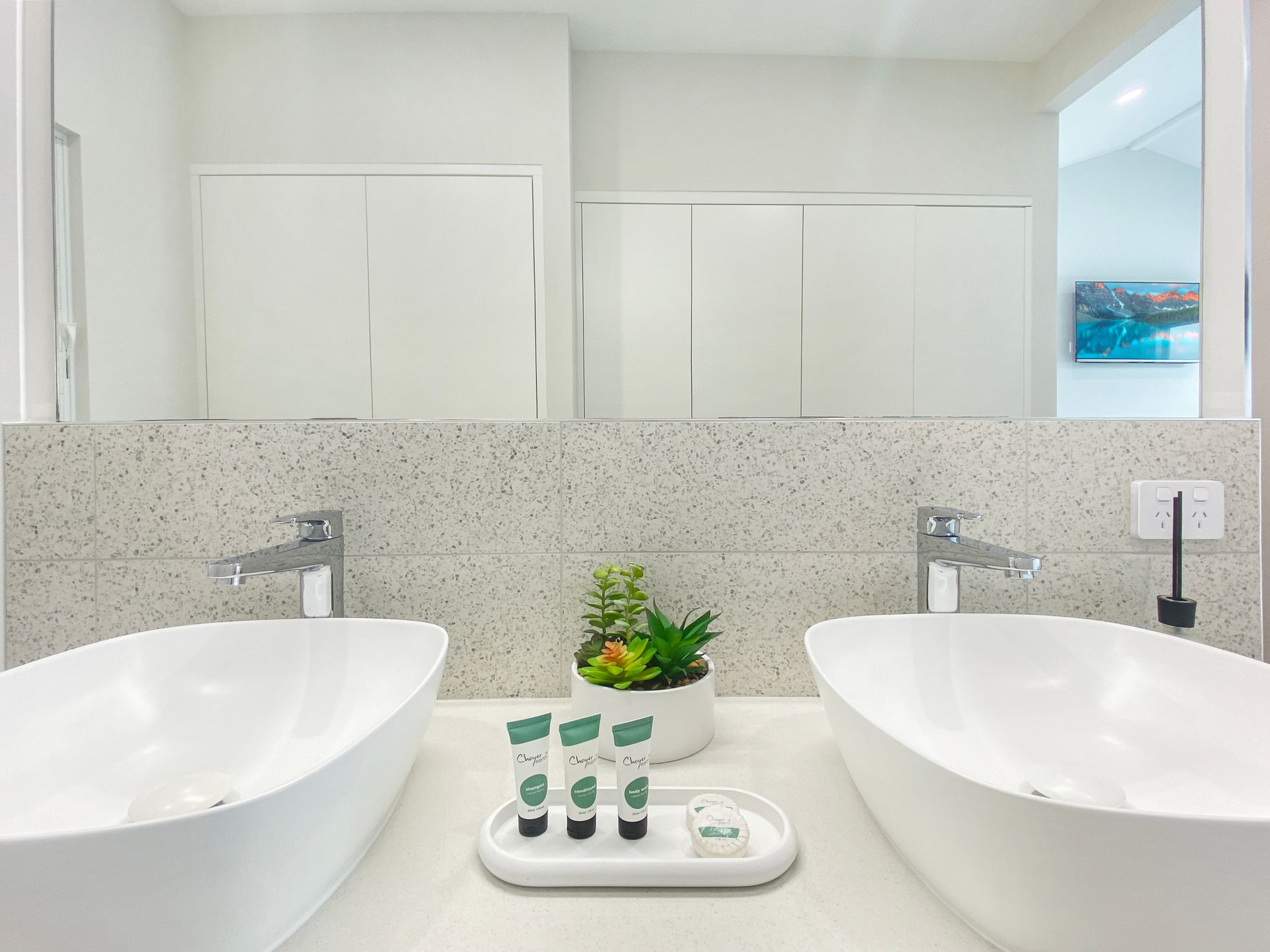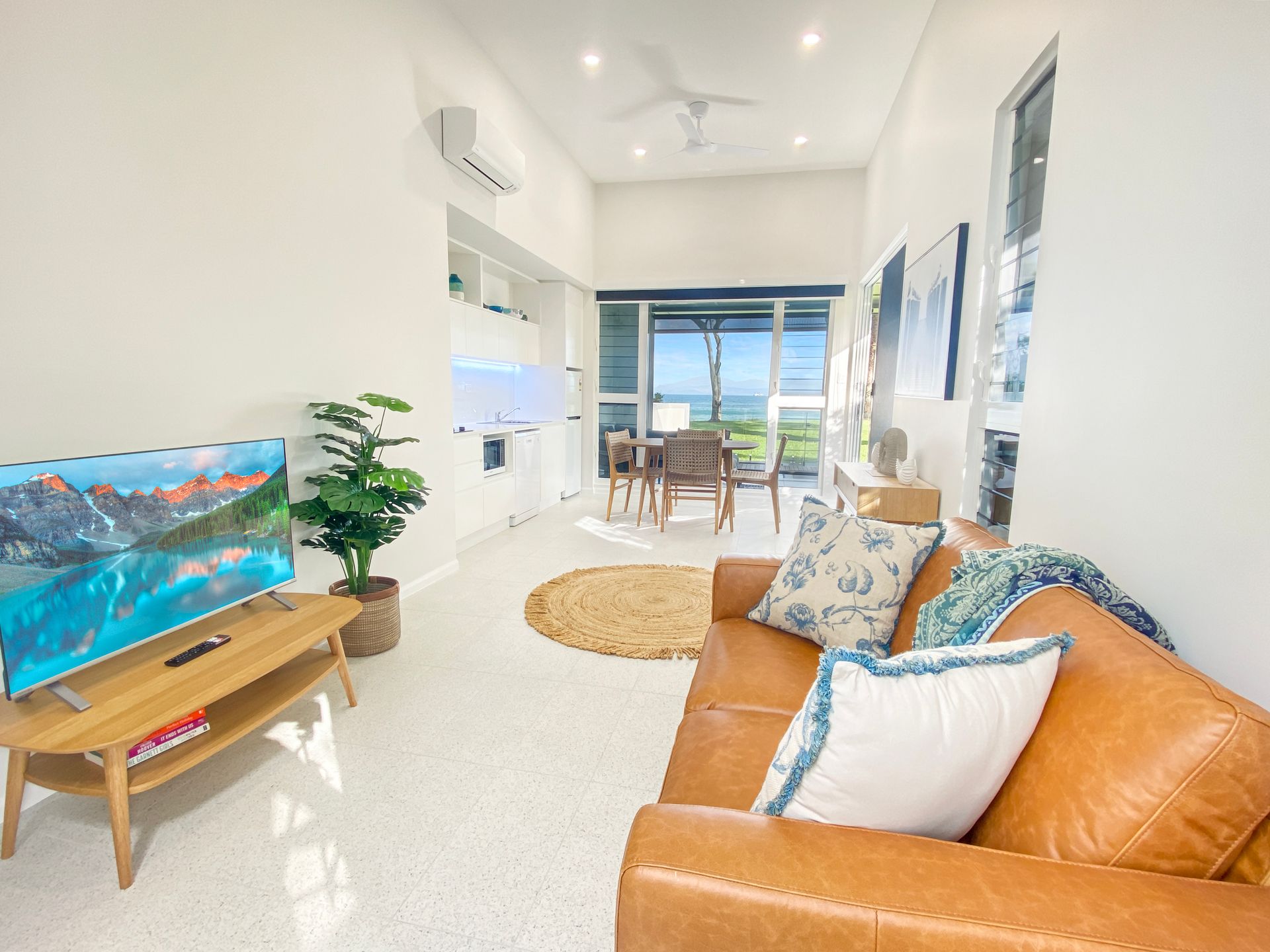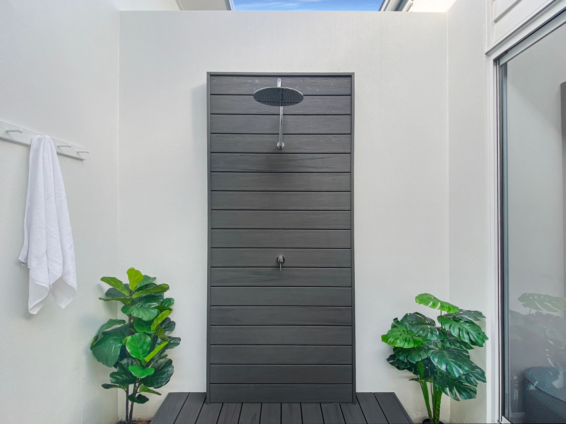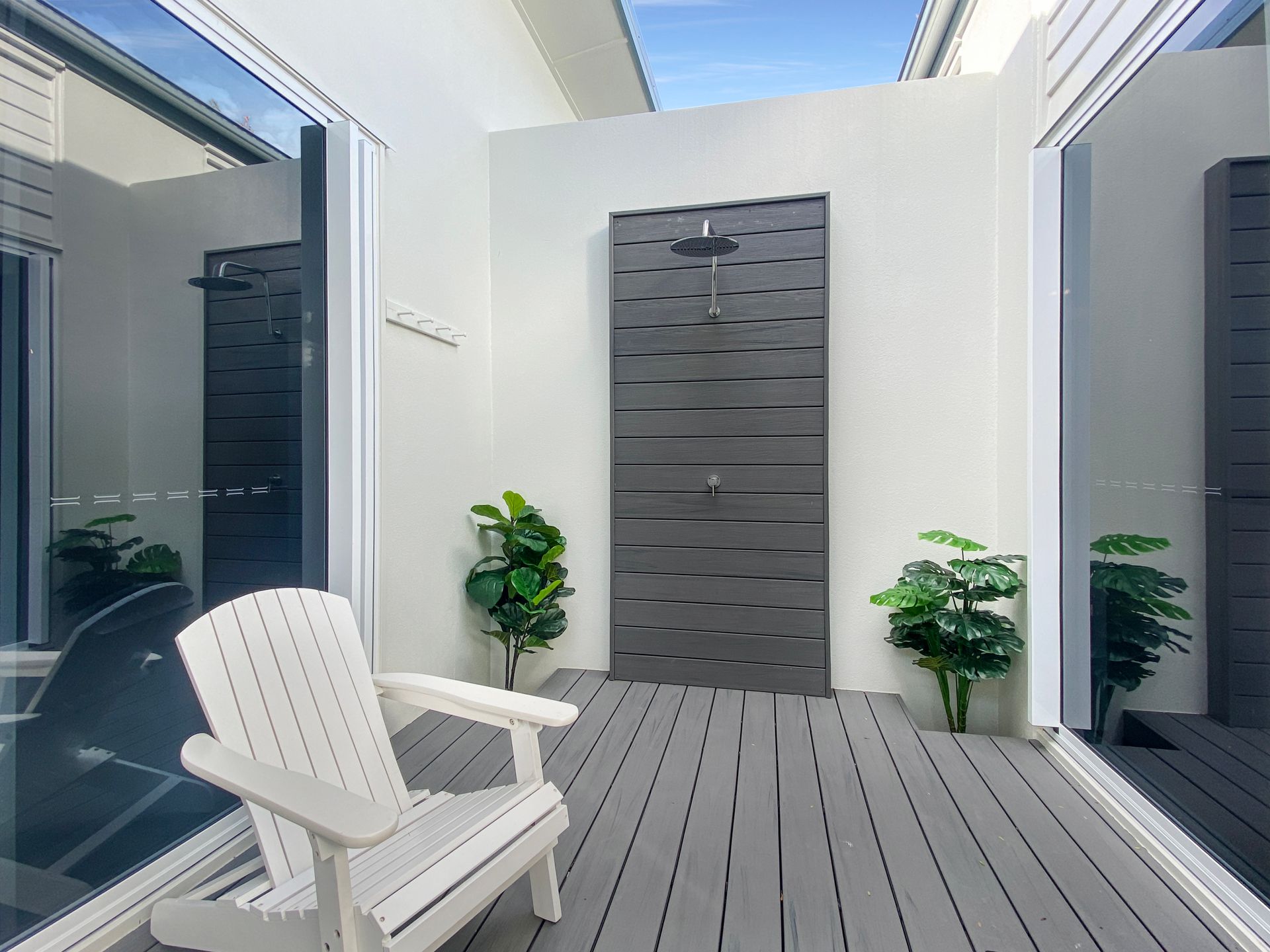 With no road between the front of your accommodation and the foreshore, you'll be able to watch the gentle waves from your inside living space and balcony areas - and even take advantage of the view from an outdoor rainwater shower!