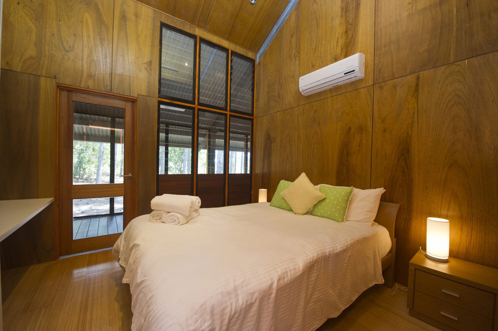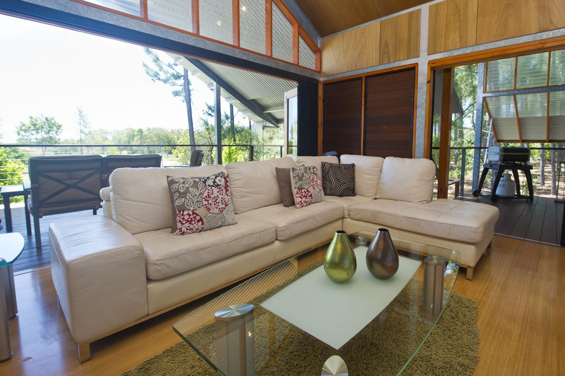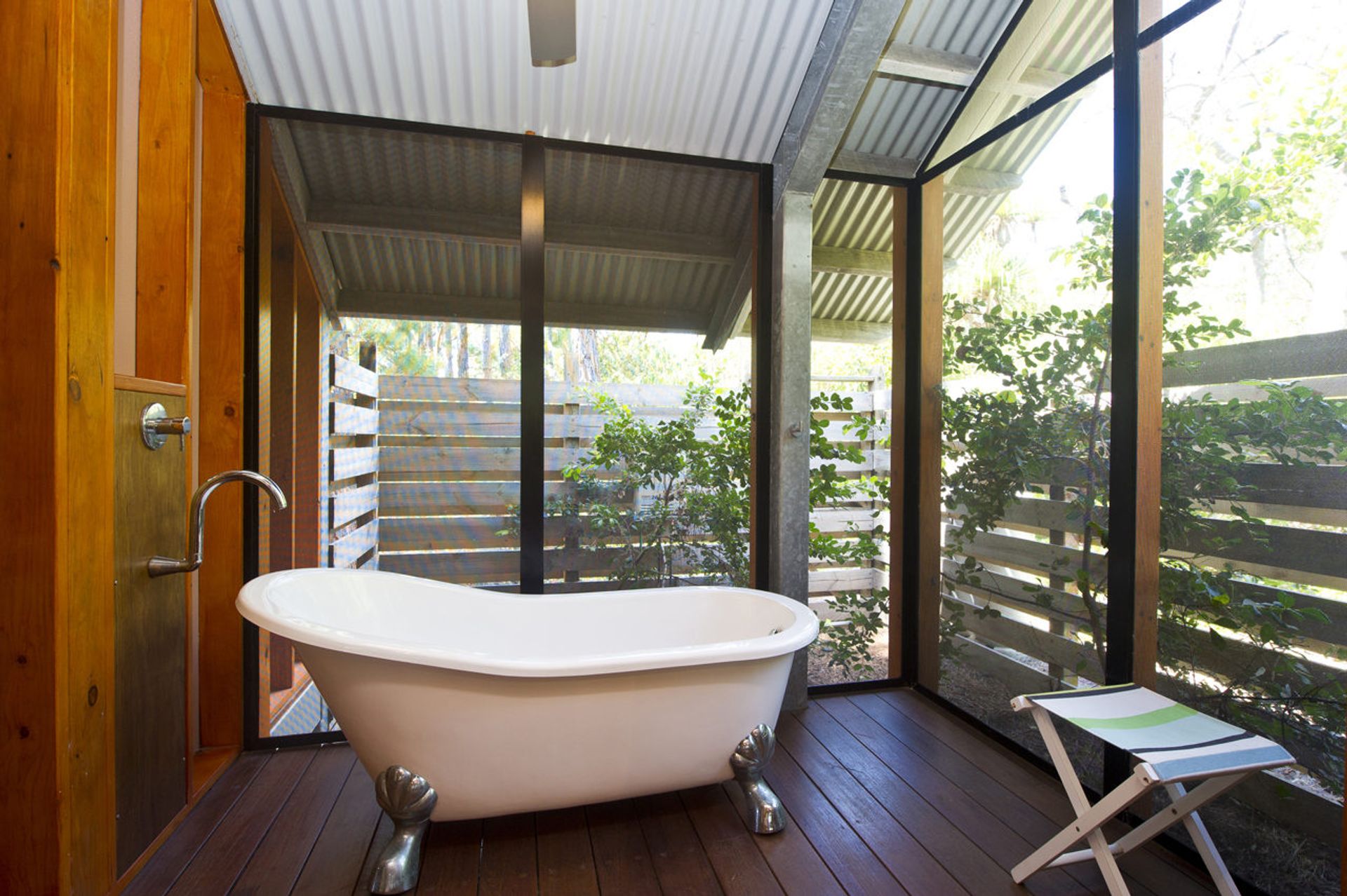 Enjoy the smell of the natural bush and pine trees. Delight in the wide overhangs that bring the outside in, but which protect you from the excesses of the sun. Shower with no shower curtains or closed in cubicles.